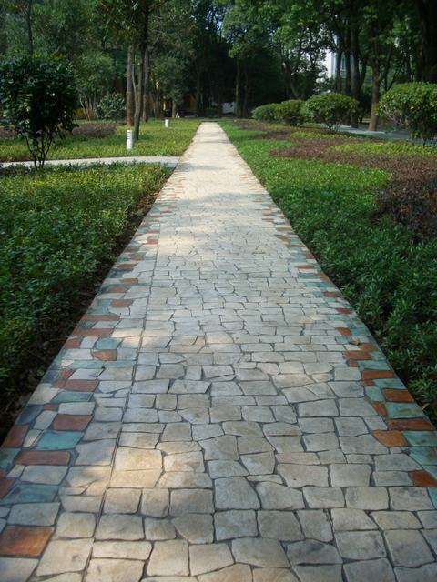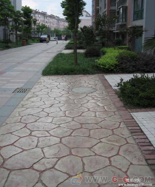 壓模前要事先研究并制訂成型模排列及提放的位置及方向,確保圖案的整體性。將第一塊成型模沿著放樣圖案參照線鋪設,并將其垂直壓進混凝土內(nèi)。施工者可以站立在成型模上,人體自身重量足以使成型模能在混凝土表層形成紋理,必要時可以使用明建成型模專用搗棒把成型模垂直地壓進施工面內(nèi),以更好地壓出清楚逼真的圖案。掌握壓模的時間非常重要,太濕或太干的混凝土表面都會影響最后的圖案及效。
